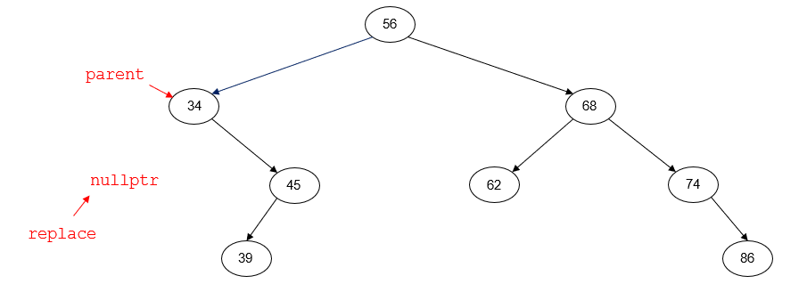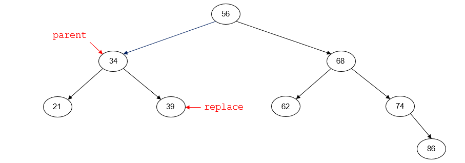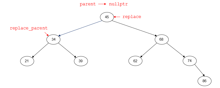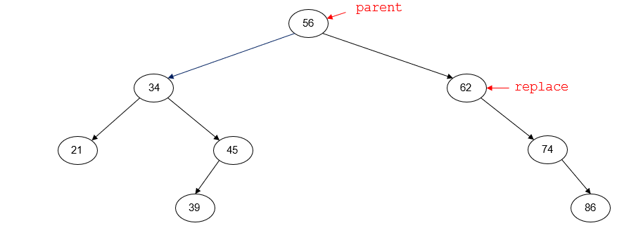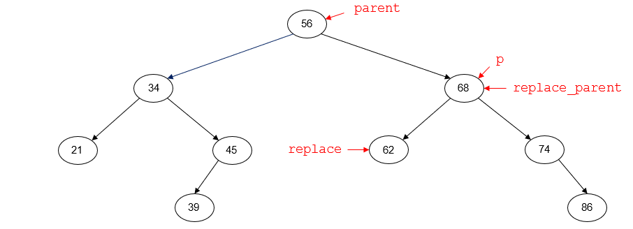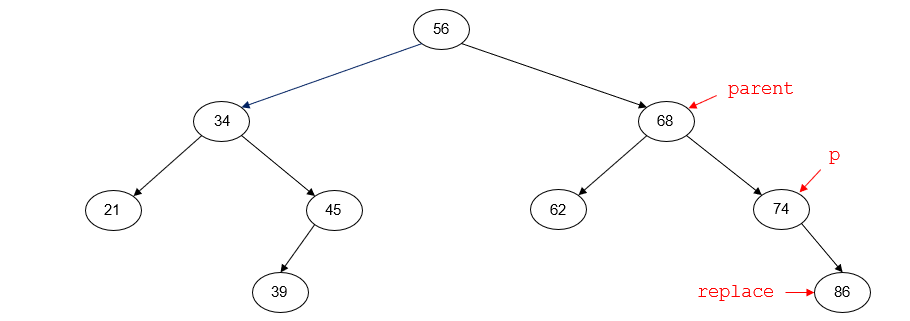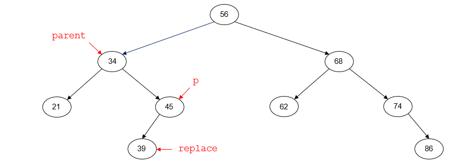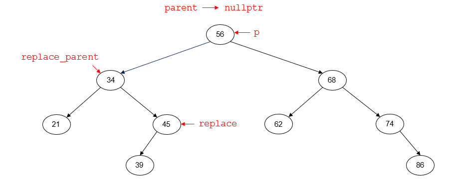 the node with key 56 is the root node of the tree and has no parent node. replace points to the inorder predecessor of p (45). replace_parent points to the parent node of