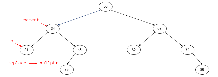 For example, suppose that we want to delete the node with key 56. Prior to deleting the node, the tree will look like the following diagram. p points to the node to be deleted (56). parent is nullptr;